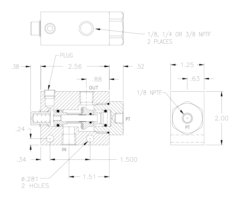 Normally open valve that closes when pressure is applied to the pilot port. To open the valve, release the pilot pressure. Internal check allows free flow from input to output.