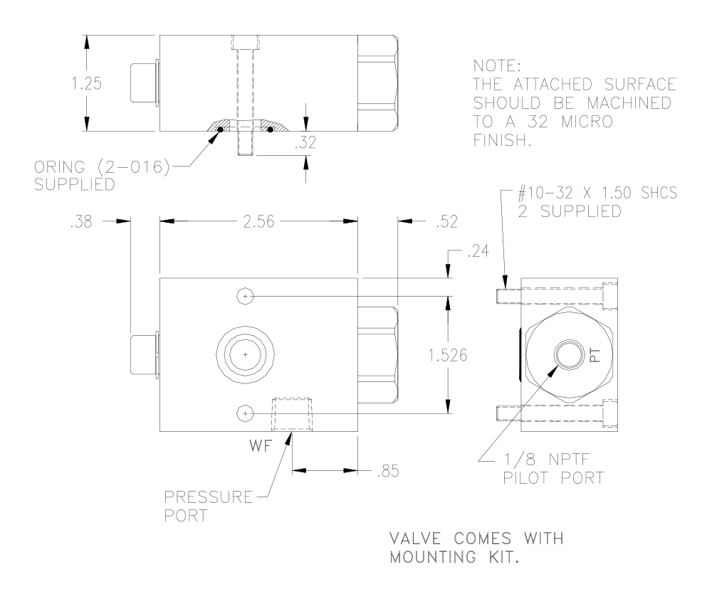 Normally open valve can be mounted directly to a manifold, air cylinder or any pneumatic device with a flat surface. Use where air tight operation is required. Pilot to close the valve. Internal check allows free frow in one direction.