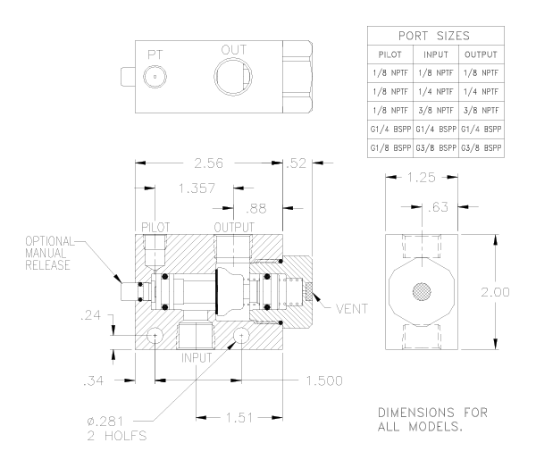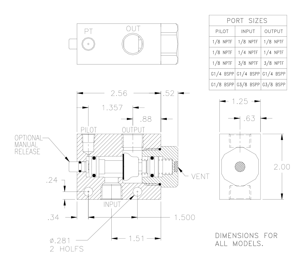 For high temp seals add (-V) to the model # (ex. B2M0M-V). For low temp seals add (-T40) to the model # (ex. B2M0M-T40). For a lower pilot pressure add (-K18) to the model # (ex. B2M0M-K18). For the non-ferrous model add (–NF) to the model # (ex. B2M0M-NF). |
