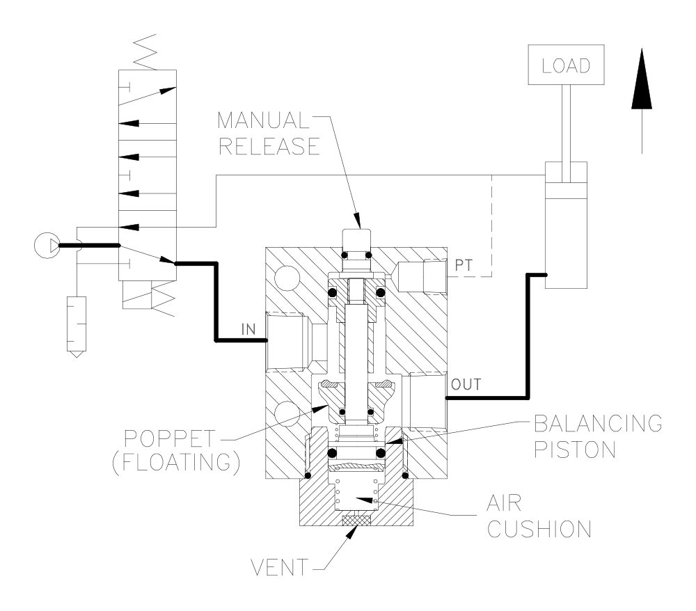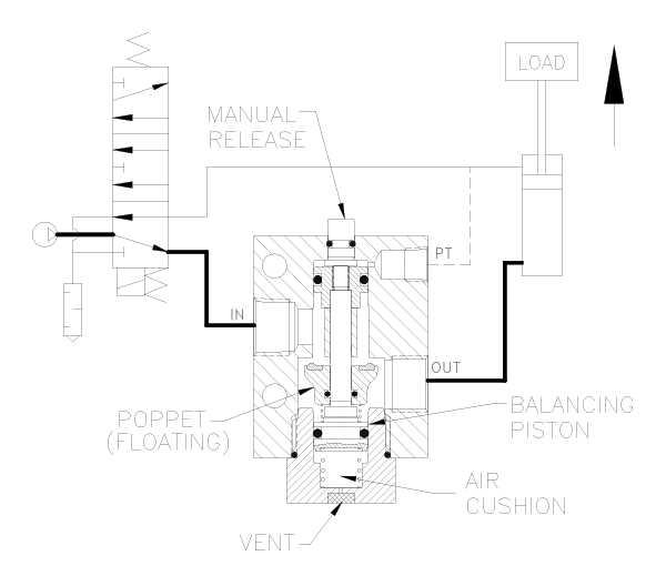 Lock your pneumatic device in position when a pressure drop or total loss of pressure occurs. Manual release for exhausting trapped air before maintaining the system (OSHA Requirement).