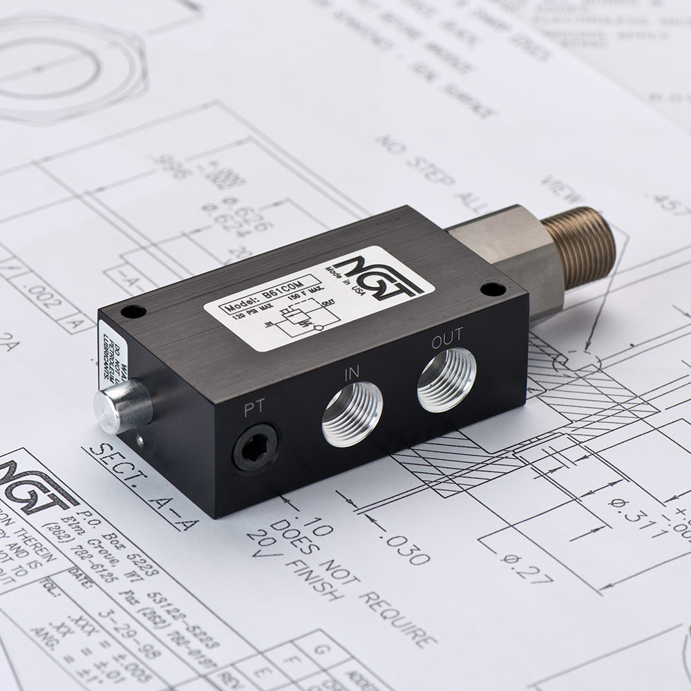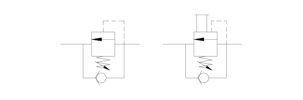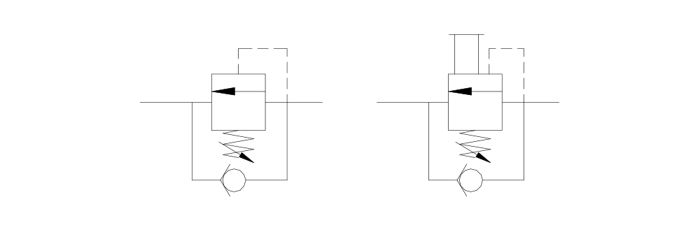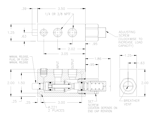 The counterbalance valve will hold a load in position until pressure or an external force is applied to move the load. Turning the adjusting screw clockwise will increase the load carrying capacity of the valve. Optional manual and flush manual release.